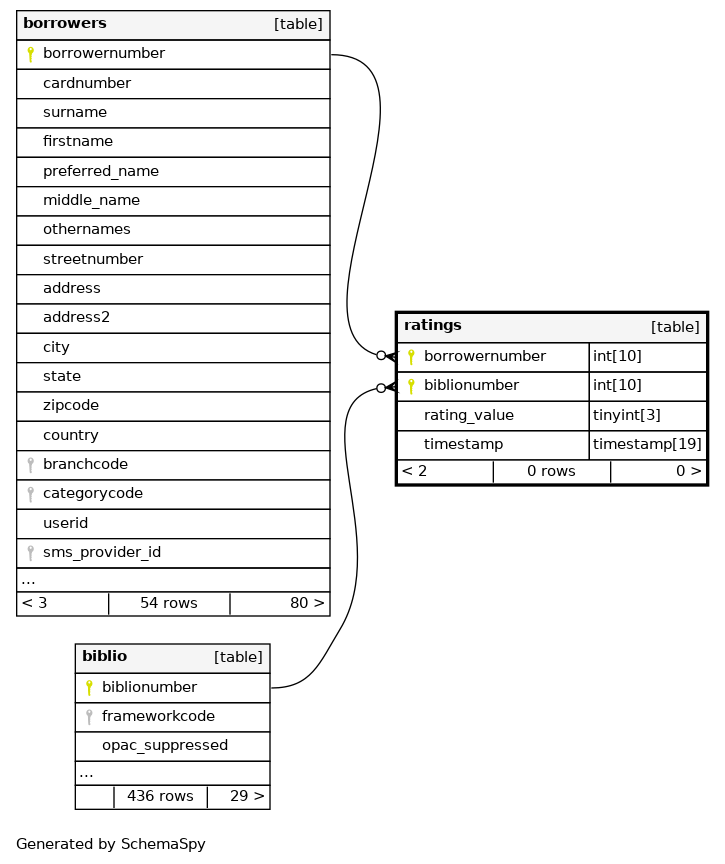 | ratings_s_pk | Primary key | Asc/Asc | borrowernumber + biblionumber |